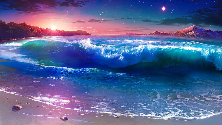 Beach Waves Sunset Scenery Anime, HD wallpaper -