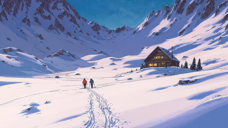 Hikers Walking Through Snow Valley, house, snow, clouds, cloud, mountains, mountain, star, sky, artist, artwork, art, digital-art, ai, HD wallpaper -