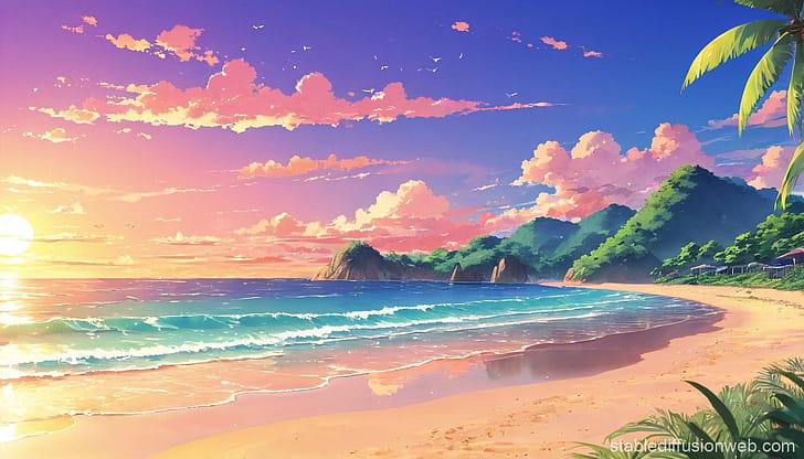 Anime Style Beach At Sunset Background. Stable Diffusion Online, HD wallpaper -