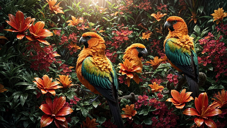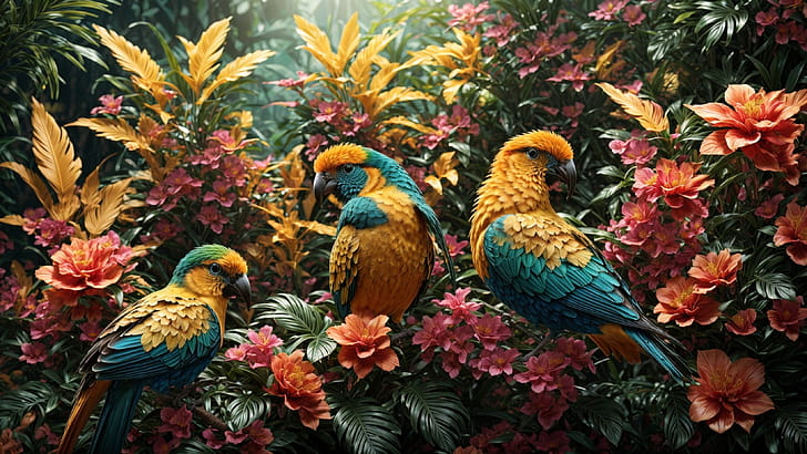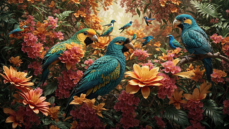 Colorful Birds, bird, colorful, flower, jungle, tree, HD wallpaper -
