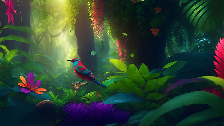 Colorful Jungle, colorful, jungle, forest, bird, tree, HD wallpaper -