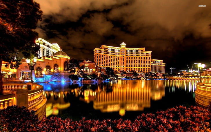 Bellagio, Nevada, Las Vegas, travel, vacation, booking, sunset, fountain, lights, night, Usa, casino Gallery, Las Vegas Sign, HD wallpaper -